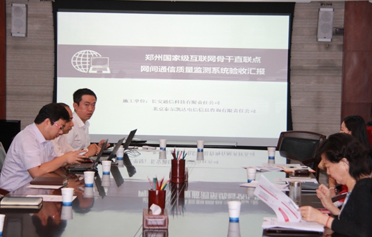 2015年6月26日,河南省通信管理局組織評審會,對長安通信承建的鄭州國家級互聯(lián)網(wǎng)骨干直聯(lián)點(diǎn)網(wǎng)間通信質(zhì)量監(jiān)測系統(tǒng)項(xiàng)目進(jìn)行了階段性驗(yàn)收。評審專家組組長、河南省通信管理局副巡視員張五萍及省通信發(fā)展處、辦公室,省內(nèi)電信、移動、聯(lián)通、鐵通等相關(guān)單位的領(lǐng)導(dǎo)和專家,長安通信CTO張建宇出席了會議。