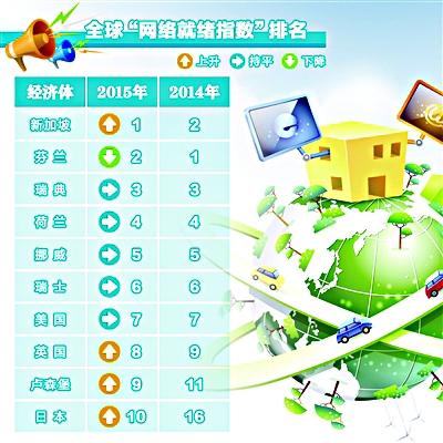 世界經(jīng)濟論壇日前發(fā)布《2015年全球信息技術(shù)報告》,對143個經(jīng)濟體的ICT發(fā)展條件和應用成效進行了評估?!秷蟾妗凤@示,在該報告的年度“網(wǎng)絡就緒指數(shù)”(Networked Readiness Index,NRI)排名中,新加坡取代芬蘭名列榜首。新加坡在運用信息通信技術(shù)(ICT)推動社會經(jīng)濟發(fā)展方面排名全球第一。中國作為亞洲最大經(jīng)濟體,排名保持在第62位?!秷蟾妗贩Q,世界各國在信息及通信技術(shù)發(fā)展和使用程度方面的差距仍在持續(xù)擴大。自2012年以來,排名前10%的國家進步幅度是后10%的兩倍。報告共同主編、康奈爾大學約翰遜管理研究生院院長蘇米特拉?杜塔表示,各國之間的數(shù)字鴻溝正在擴大。在技術(shù)大步前進時,這個問題更加令人擔憂。欠發(fā)達國家有可能會更加落后,必須盡快采取具體行動,應對這樣的局面